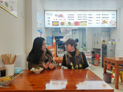 (图为队员采访非遗“吴凉面”店铺经营人王女士)