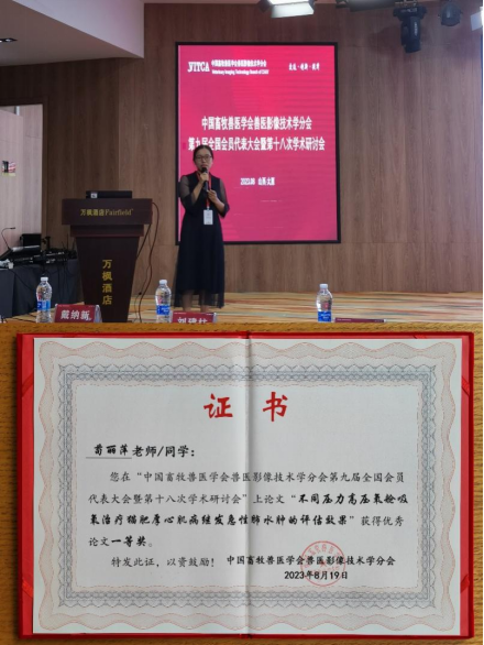 565net必赢客户端任志华教授、苟丽萍老师参加了此次会议。苟丽萍老师做了主题为《不同高压氧治疗猫肥厚性心肌病继发急性肺水肿的疗效观察》的专题报告,介绍了猫肥厚性心肌病继发急性肺水肿的发病原因、诊断方法以及高压氧在治疗该病过程中的作用以及效果。同时,苟丽萍老师所投论文《不同压力高压氧舱吸氧治疗猫肥厚性心肌病继发急性肺水肿的评估效果》获得优秀论文一等奖。