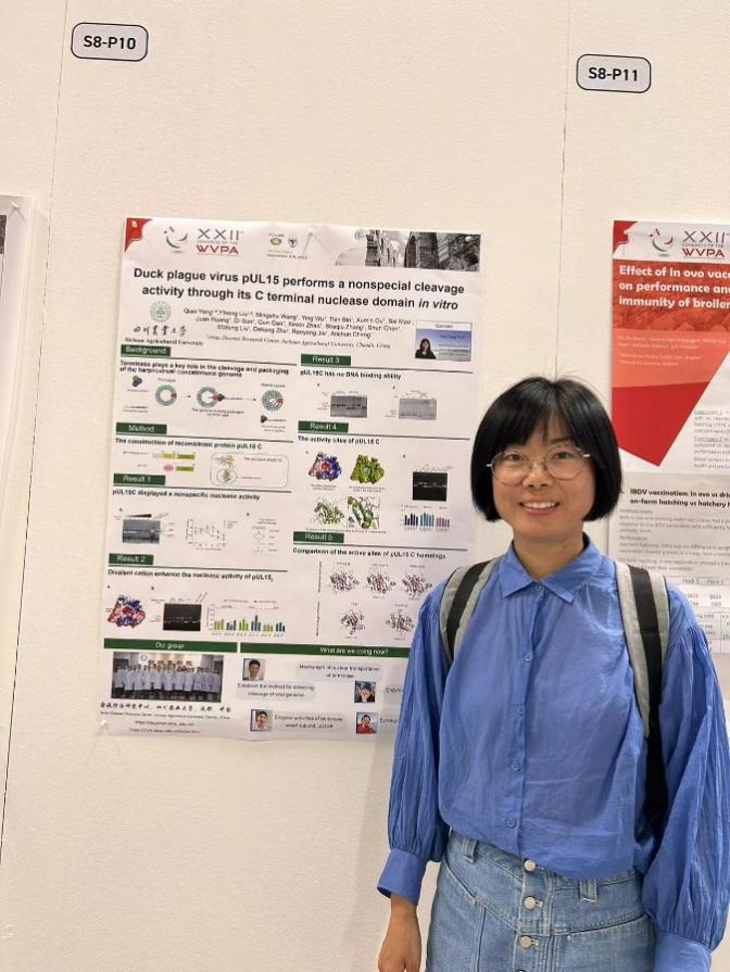 9月4日至8日,2023年世界兽医家禽大会(WVPA)在意大利维罗纳成功举办。来自全球各地的1700余名专家学者齐聚一堂,共同交流和分享家禽养殖方面的研究成果。565net必赢客户端禽病防治研究中心青年教师杨乔博士受邀参会,并展示了名为“Duck plague virus pUL15 performs a nonspecial cleavage activity through its C terminal nuclease domain in vitro”(相关内容已发表在Veterinary Microbiology)的学术海报。