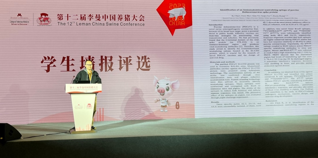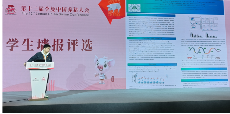 猪δ冠状病毒(PDCoV)结构蛋白SLA-I限制性T细胞抗原表位的鉴定)”。他们的汇报主要介绍了我校猪病研究中心在猪δ冠状病毒(PDCoV)的B细胞中和抗原表位与T细胞抗原表位的最新研究进展。该研究为PDCoV免疫机制及新型疫苗研发奠定了基础。